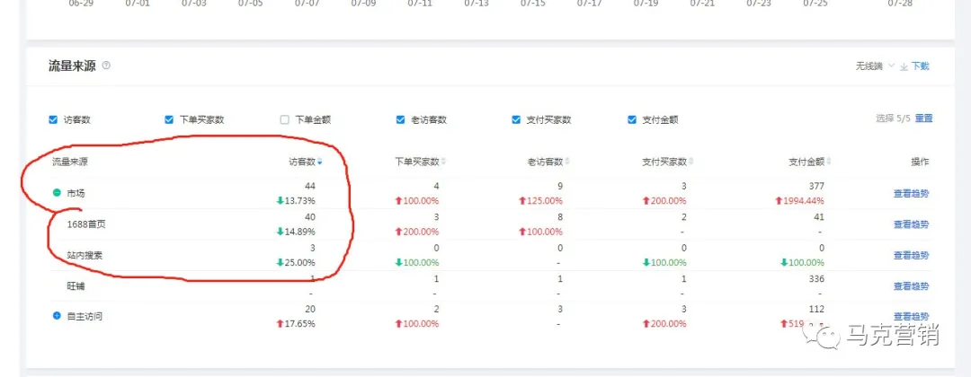 这款产品他流量下降的原因是 因为【1688首页】和【站内搜索】的排名不稳定,导致他流量下降了。那么我们这一款单品的分析就已经计算出来了。那么我想看全店的关键词怎么办呢?------------生意参谋---豪华版---流量---入店关键词
