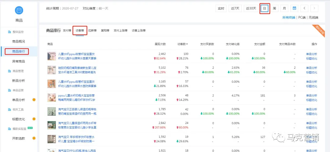 那么这里有两个指标:一个是展现次数、广告展现次数。顾名思义:这里的展现指数指的是全盘包含了网销宝的数据推广的一项数值广告展现次数:这里包含了网销宝【数字营销平台】的数据推广的数值。那么问题来了。我想看到我店铺的自然流量可以算吗?可以的 【公式:展现次数-广告展现次数=店铺日常展现】那么接下来我们要学会怎么看商品的涨幅或者下降 【生意参谋---商品---商品排行】注意看我们要点 【日】才能看得到昨天的哦~ 那我们继续