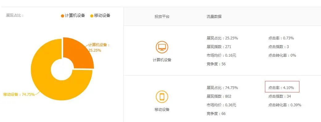 行业均值怎么查:流量解析里面查4-5个展现指数较大的并且相对匹配宝贝的词,单独看无线的点击率,计算出来平均数就大概是你这个宝贝类目的平均点击率,如下图: